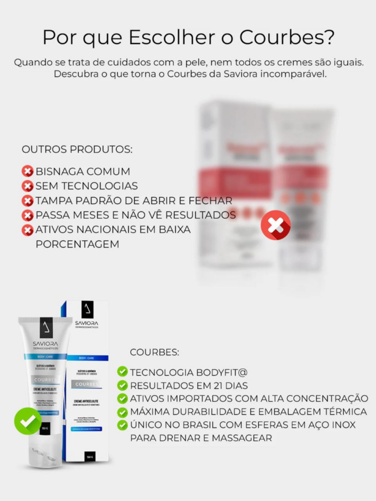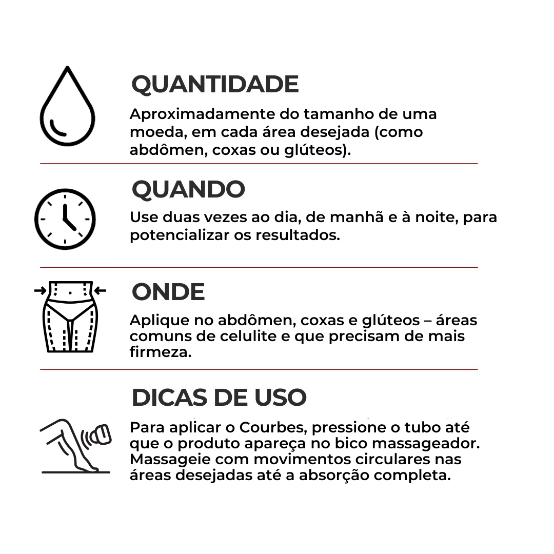 Especialmente desenvolvido para mulheres que buscam uma pele mais firme e lisa, o Courbes atua diretamente nas áreas mais propensas ao acúmulo de gordura e à flacidez, promovendo uma pele mais uniforme e tonificada, sem irritar ou deixar resíduos oleosos.