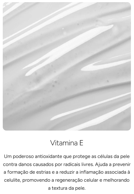 Cada ativo foi cuidadosamente selecionado para proporcionar os melhores resultados, garantindo uma pele mais firme, tonificada e livre de celulite e estrias.